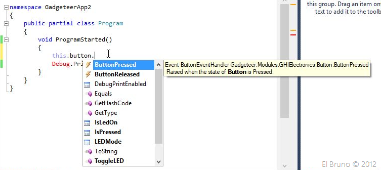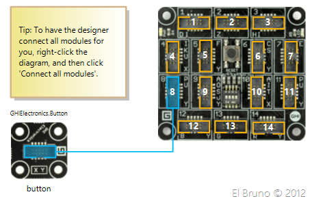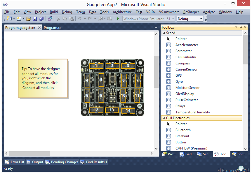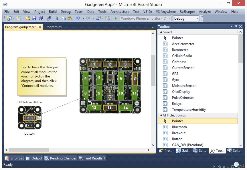 Y ya estás listo para escribir tu primera aplicación. En este caso y para los siguientes ejemplos utilizaremos los sensores que vienen con el Kit “FEZ Spider Starter Kit”: