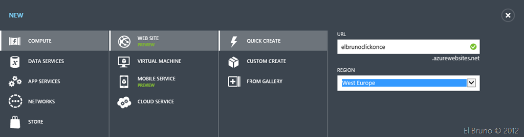 1. En el portal de AZURE (www.azure.com) creamos un nuevo elemento de tipo “COMPUTE // WEB SITE / QUICK CREATE”.