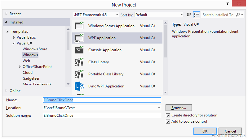 3. Listo AZURE, ahora vamos a Visual Studio 2012 y creamos un nuevo proyecto de tipo WPF Application. En este caso la he llamado “ElBrunoClickOnce”.