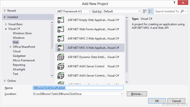 8. Ahora que tenemos nuestra aplicación, procederemos a publicar la misma en website de Azure. Para esto primero agregaremos un proyecto de tipo ASP.Net MVC 4 a nuestra solución. En este caso lo he llamado “ElBrunoClickOncePublish”.
