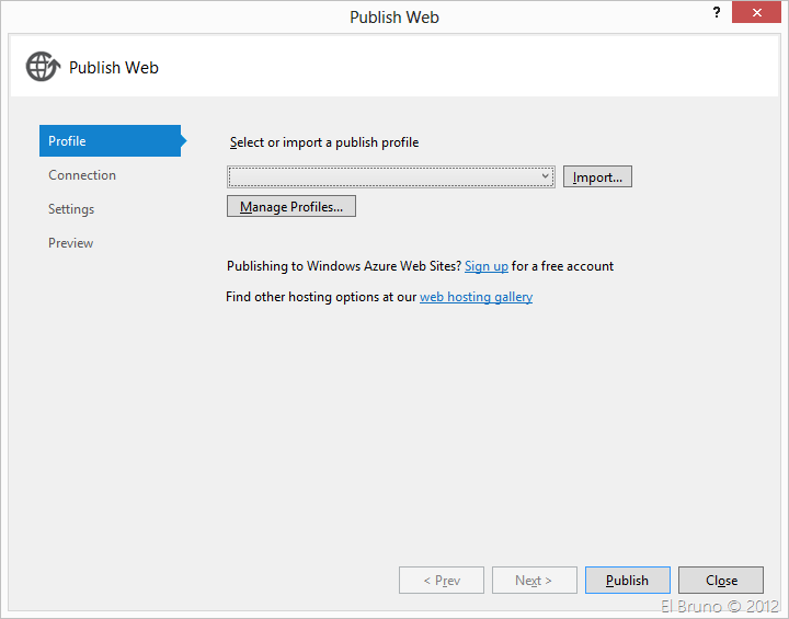 11. A continuación debemos seleccionar un perfil para la publicación. Podemos descargar este perfil desde la consola de administración de AZURE de nuestro website.