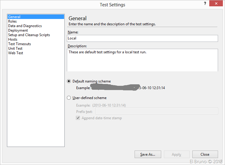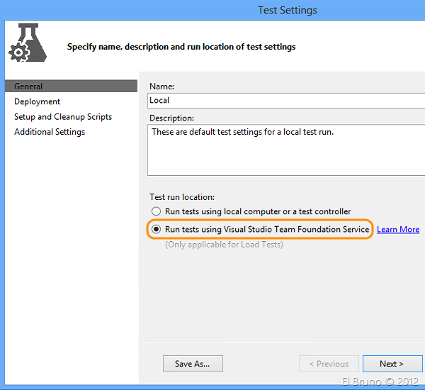 Además de las novedades que llegarán de la mano de Visual Studio 2013 y de Team Foundation Server 2013, hay una muy interesante que está disponible en Team Foundation Service aunque solo puedes probar con Vs2013: la capacidad de realizar Load Tests utilizando Team Foundation Service. Por ejemplo, cuando hoy editamos un archivo de configuración para la ejecución de tests vemos las siguientes opciones en VS2012.