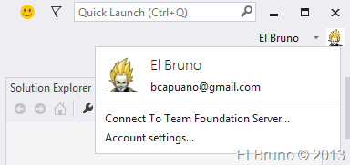 hoy vamos con un rapidito de Visual Studio 2013; los nuevos perfiles de usuarios para Visual Studio 2013. Si te ha fijado en el nuevo IDE que en la parte superior derecha tenemos nuestro perfil de usuario. Esto claro, si al lanzar el IDE hemos puesto usuario y password para identificarnos con una Microsoft Account.