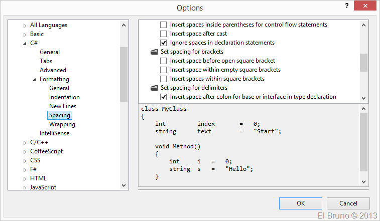 Ojo, deshabilitando las opciones por defecto de “Insert space after … “ en el formateo de C#.