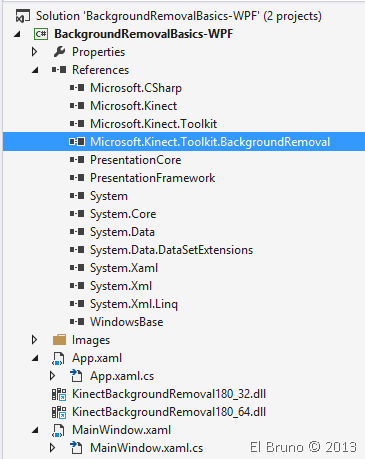 Una vez descargado el código fuente de este ejemplo, vemos que el mismo utiliza 2 dlls externas., compiladas para x86 y x64. Estas dlls están creadas con C++ (también se puede acceder al source code de las mismas) y poseen un wrapper .net, que podemos ver como una referencia: Microsoft.Kinect.Toolkit.BackgroundRemoval