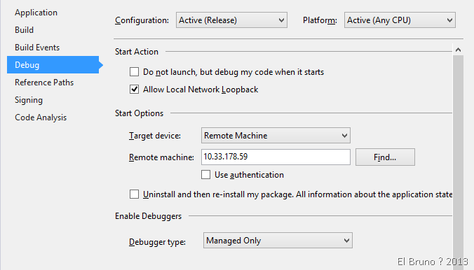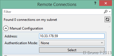 En esta vista podemos definir manualmente una IP para conectarnos a un ordenador remoto, o ver la lista de remote debuggers disponible. Como en mi caso, no poseo la capacidad de trabajar con autenticacion Windows (thanks WinRT), he modificado la configuración del host remoto para que acepte TODAS LAS LLAMADAS INCLUSIVE LAS LLAMADAS ANÖNIMAS