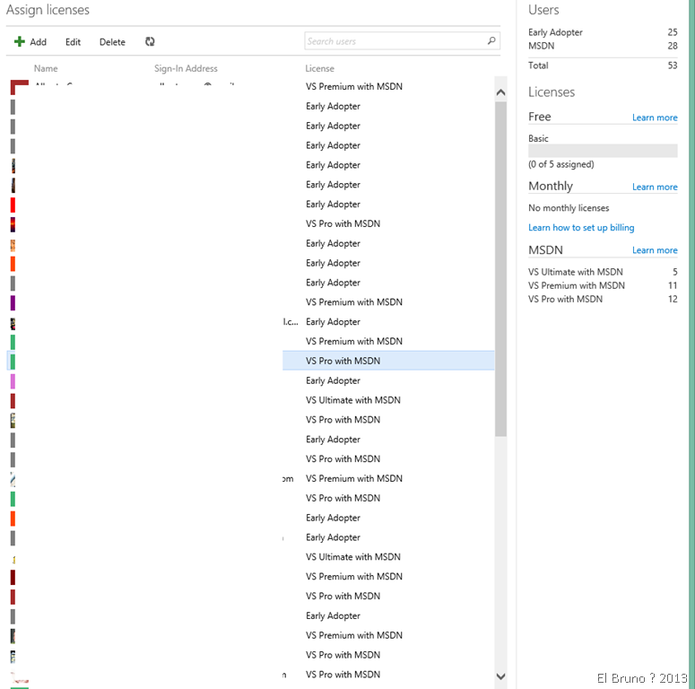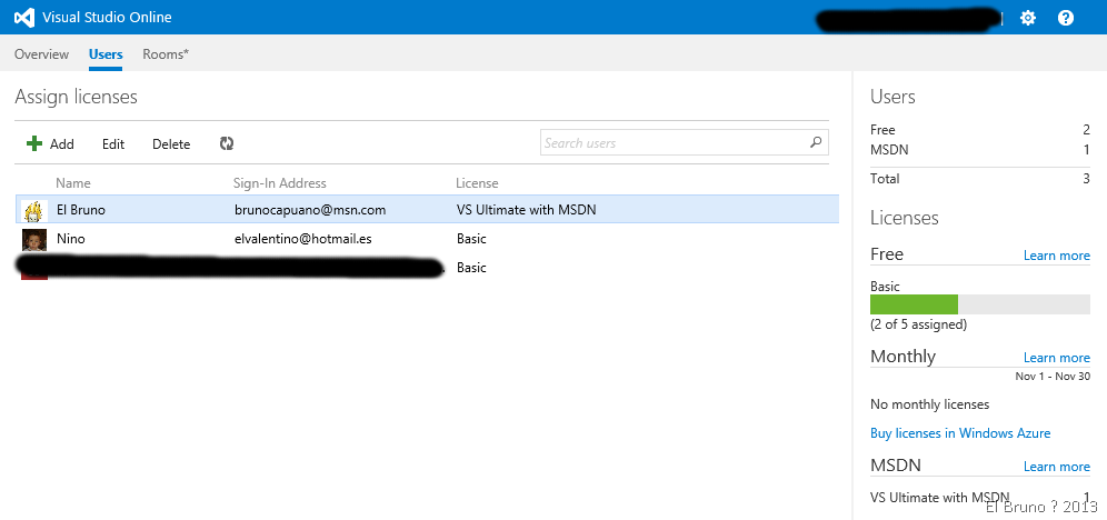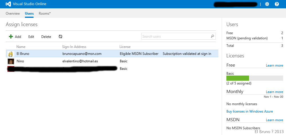En este momento también podemos acceder a la seccion Users. En la misma podremos agregar las diferentes cuentas con las que trabajaremos en esta instancia de VSOnline. En la siguiente imagen, he agregamos mi cuenta de MSN y la cuenta del Valentino. A mi cuenta la he marcado como una cuenta asociada con una suscripción MSDN, y se validará en el primer login al site.