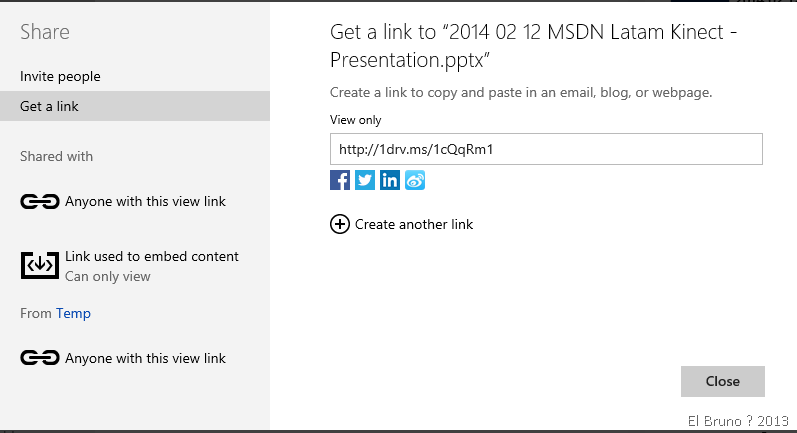 Cuando seleccionar una presentación de PowerPoint en SkyDrive, tienes la opción de compartir la misma (SHARE). Esta opción es interesante porque te permite crear un link para que otras personas puedan ver o editar tu pptx.