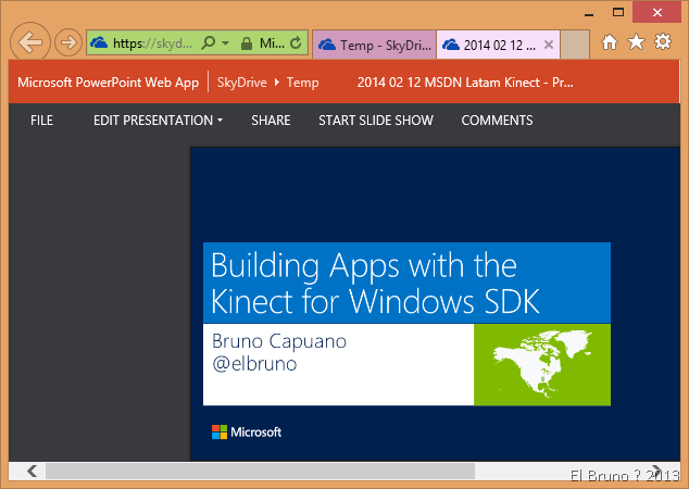 Todo el mundo sabe que SlideShare es la plataforma mÔs popular para compartir presentaciones. Yo veo en mi perfil que después de varios años, tengo 29 presentaciones en mi perfil y algunos seguidores. Ahora bien, hoy mientras acomodaba algunos contenidos en SkyDrive / OneDrive, me dà cuenta de que desde aquà también es posible compartir slides.