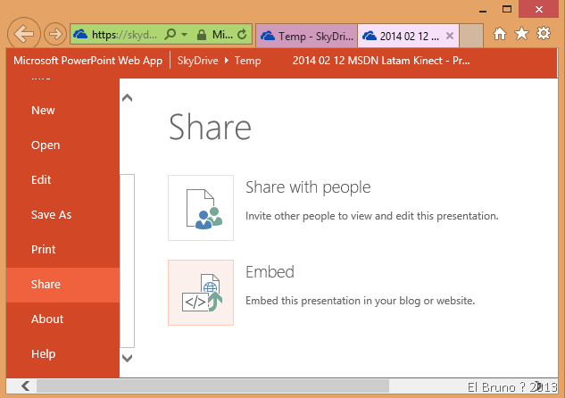 Ahora bien, existe una opción que te pemite embeber el visor web de PowerPoint en una pÔgina HTML, aumque estÔ un poco escondida. No lo busques dentro de las opciones de SHARE porque no lo encontrarÔs.