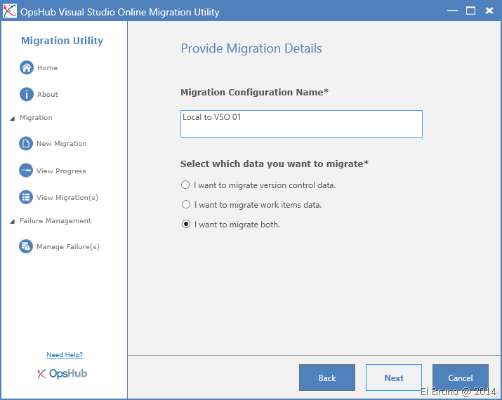 Definimos el tipo de migración, Source Control, WorkItem data o ambos.