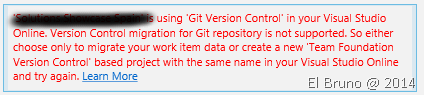 Lo mismo sucede si por ejemplo, queremos migrar un proyecto que use la plantilla de CMMI hacia uno de SCRUM, o uno que use Team Foundation Version Control a GIT; en este caso veremos un mensaje similar al siguiente