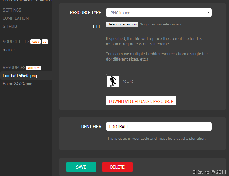 After my previous post on How to subscribe to the click event button in Pebble, today I will continue with the example, doing an app a little bit more interactive. The first thing is to add a couple of images that we are going to use in the app. Using MetroStudio (excellent app with many free examples of icons, I wrote here on the subject), I added the following image, a png of 48 × 48 pixels in size. Only black and white colors. I’ve set the ID of this resource as [FOOTBALL]