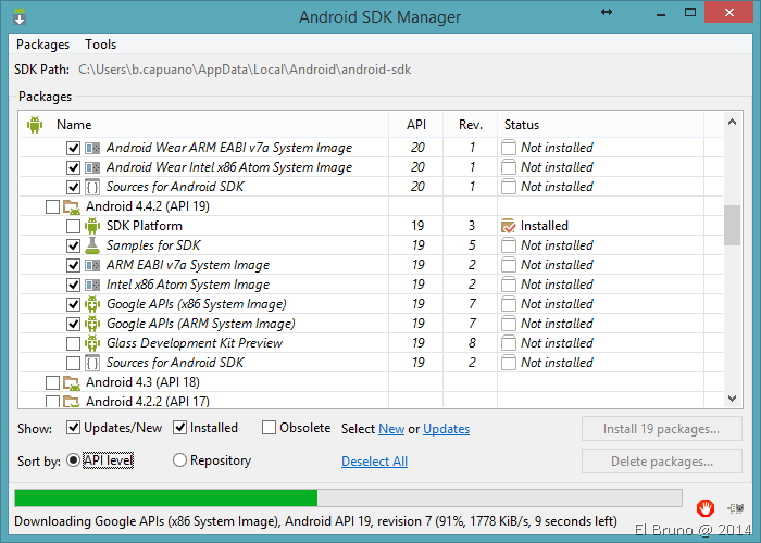 Y dentro del mismo ya podemos lanzar [SDK Manager.exe], que es la app que se encaga de gestionar los recursos de Android SDK que tenemos instalados localmente. En la siguiente imagen se puede ver como he seleccionado recursos para API Level 19 y he decidido descargar además un par de imágenes para poder trabajar con las mismas.