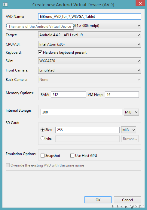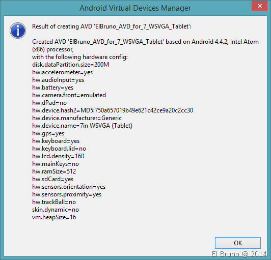 Y veremos que … todavía tenemos sólo los emuladores para API Level 10 y 12. Asi que ahora toca crear un nuevo AVD con las definiciones que nosotros necesitamos. Para esto click en Create y por ejemplo, creamos uno para un Nexus 7 con las siguientes configuraciones.