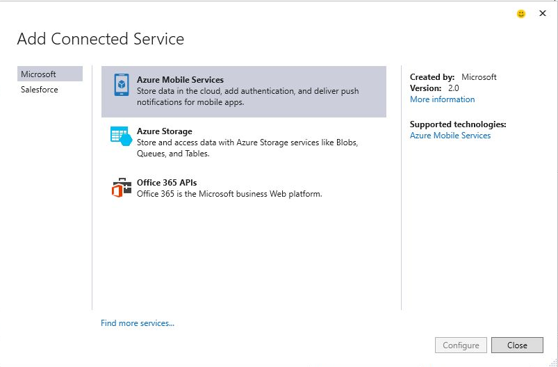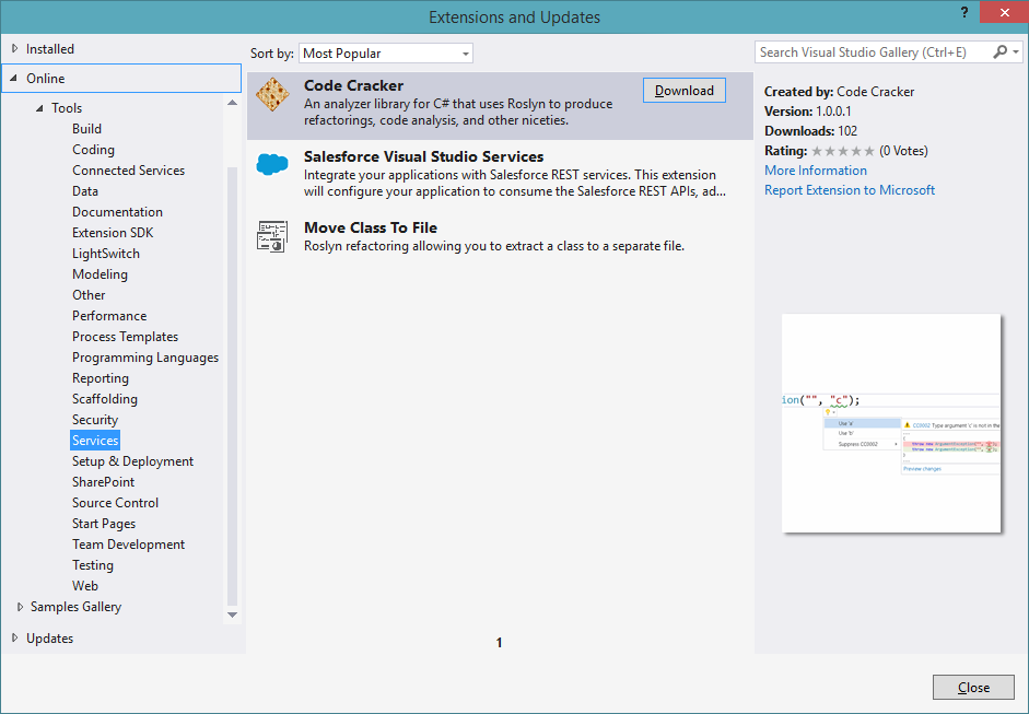 And most importantly, this “store” of connected services is 100% expandable. If in the previous step, we decided to add other services, this action will take us to Visual Studio Gallery where we have a category “Services”. From here we only have to download the VSIX, install, restart Visual Studio and ready