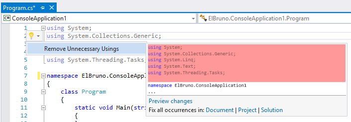 We can see that in addition to a menu where it offers us the action of removing the unnecessary usings, we also have the option to do it at the level of file, project, or solution. Another scenario where we can change a concatenation of strings horrilble to use a string.format () is also possible, in this case thanks to Refactory.One
