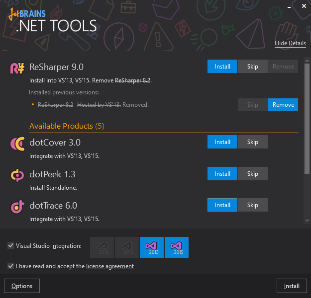 As I said before, this kind of actions we know them of ReSharper.Y clear, as always in these cases ‘pressure’ passes to extension to see with that is surprising in the new version. In this case in version 9, the first thing that will get us attention is that ReSharper is no longer an isolated product and becomes part of “JetBrains .net Tools“. What personally I seems great. The JetBrains guys typically make very good products and have a same installer R #.dotTrace, dotCover and dotPeek, is already on a great idea.