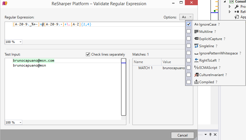 Needless to say that I belong to 99% of the population to Hate regular expressions. Although they can be something very useful for basic tasks like validate an email, when we started using for replaces strange, since SkyNet begins. There are many tools to validate regular expressions (e.g. RegExBuddy), now well of R # has the touch of JetBrains and is very well integrated within the IDE.