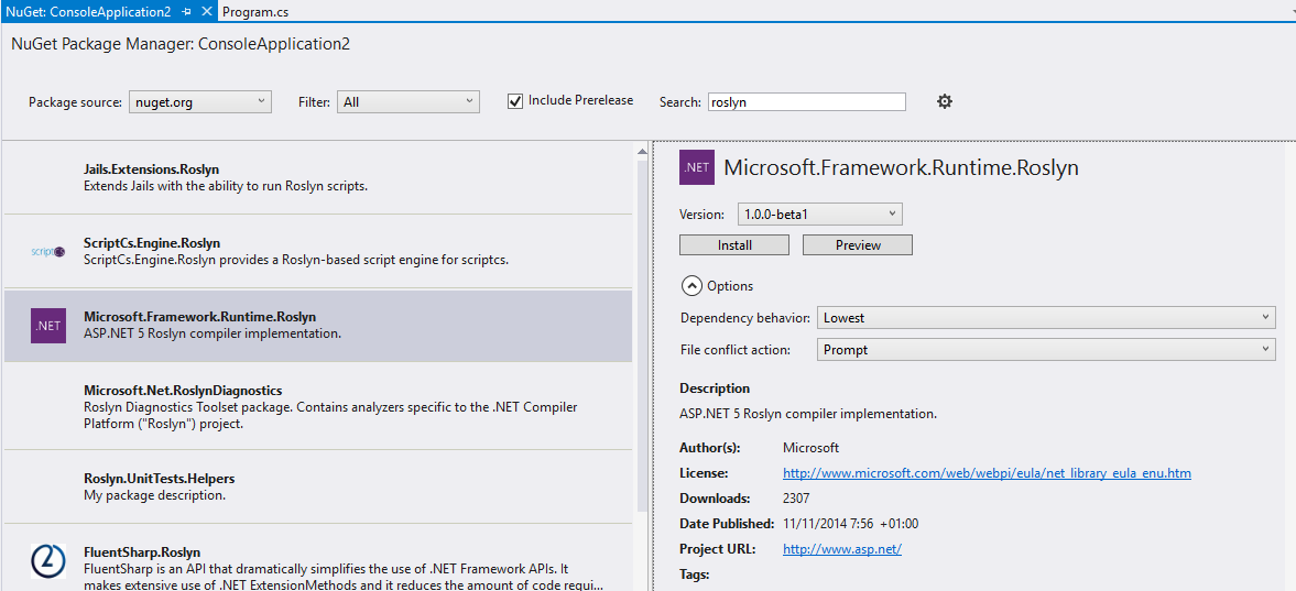 Es bastante cool esto de poder seleccionar por ejemplo, el runtime de Roslyn y agregarlo con una versión específica a un proyecto.
