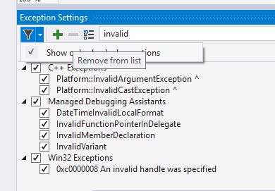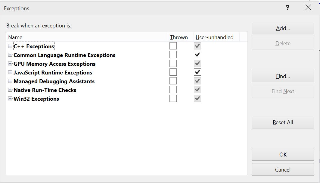 Si eres un aficionado a los atajos de teclado en Visual Studio, pues seguro que cada tanto utilizas el CTRL + ALT + E. Esta ventana es todo un clásico cuando depuras apps, ya que en la misma defines frete a que tipo de excepciones Visual Studio debe interrumpir un proceso de depuración.