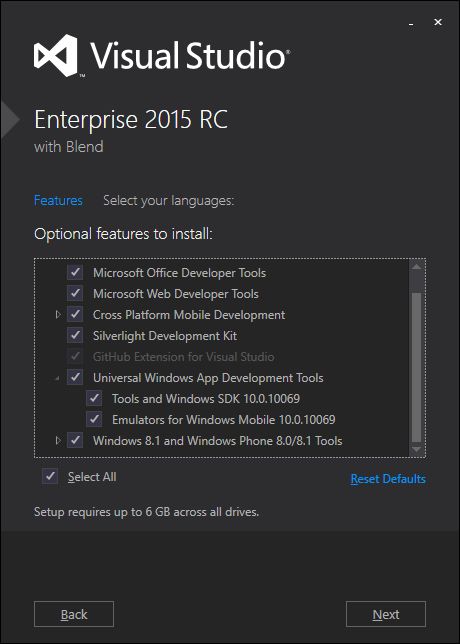 Hoy toca un poco de código con Visual Studio 2015 RC. Lo primero que haremos es crear un proyecto del tipo Windows Universal Blank App. Si no ves este tipo de proyectos en Visual Studio, tienes que ir a “Programs and Features” y cambiar las opciones de instalación de Visual Studio 2015 RC. La opción que debes seleccionar es “Universal Windows App Development Tools”