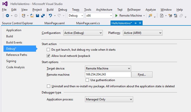 8. En las propiedades del proyecto, en la sección “Debug” cambiamos las opciones de inicio para que se despliegue y depure en modo remoto. En la sección Remote Machine pondremos el nombre o IP del device