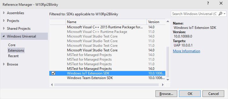 En cada tick del timer cambiaremos el estado del LED en el Pin 4 de ON a OFF, luego ON, etc. Para poder comenzar la interacción con los Pins digitales del device, necesitamos agregar una referencia en nuestro proyecto a Windows IoT Extension SDK