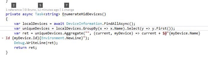 El ejemplo es bastante sencillo, solo llamar a DeviceInformation.FindAllAsync(), un poco de linq para eliminar los duplicados y listo