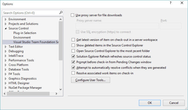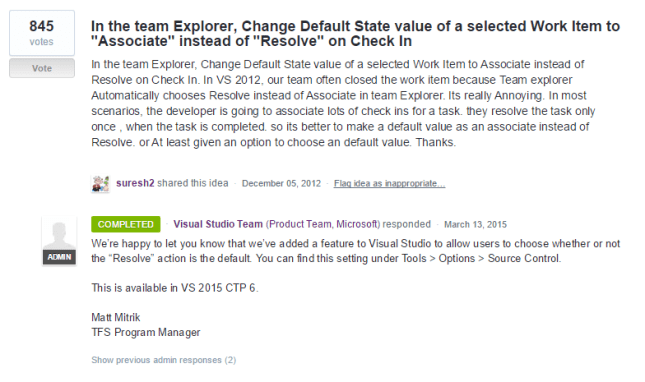 I think it was on 2008 when I wrote my first post with a workaround to change the default behavior in a CheckIn action for a WorkItem: do an Associate instead of a Resolve updating the states definition of the WorkItem. Later we get new options, like the Registry entry. Now with Visual Studio 2015 this is finally part of the IDE configuration options.