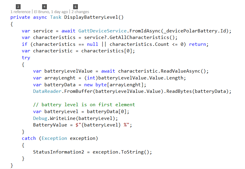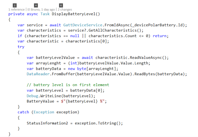 El siguiente paso es obtener el valor de la carga de la batería. A diferencia del post anterior, en donde recibíamos los valores en un evento, en este caso accederemos a la característica del device y leeremos el valor de la misma.