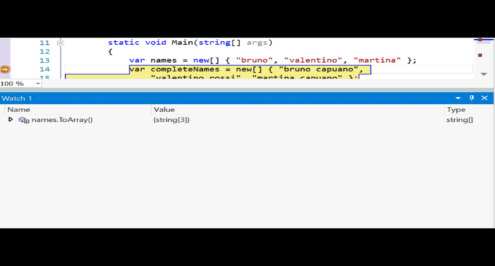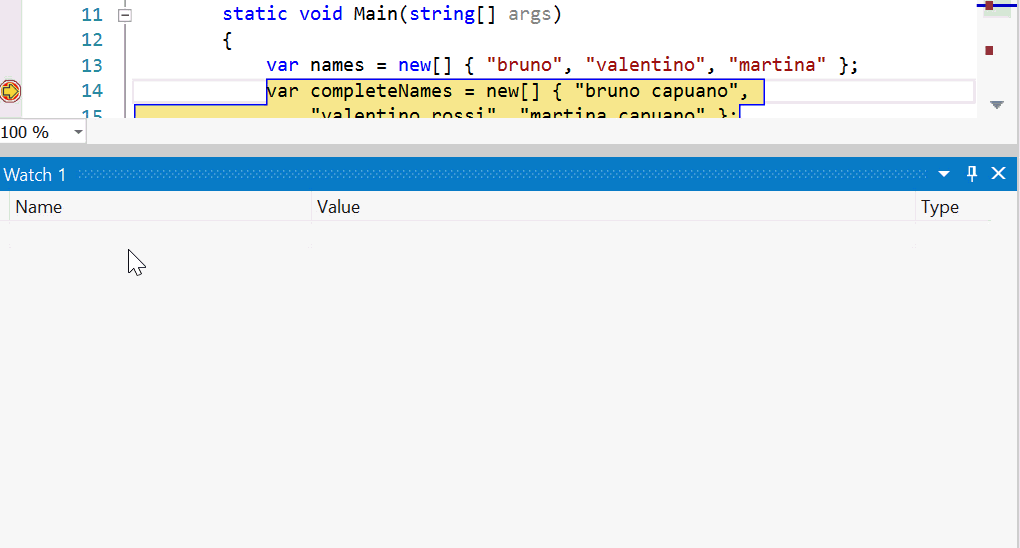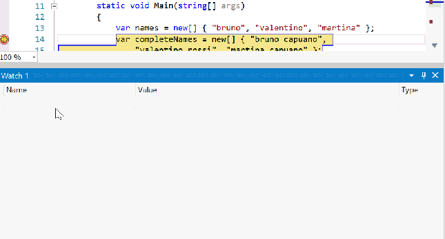 Siguiendo con el ejemplo de ayer, luego de declarar un array de elementos, podemos detener el depurador y analizar el contenido del array de una forma muy declarativa en la ventana de Watch. Es intersante ver que también tenemos Intellisense y otras ayudas online