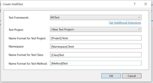 Si no tenemos un Proyecto de test en nuestra solución, IntelliTest nos propondrá una serie de opciones para crear un nuevo proyecto.