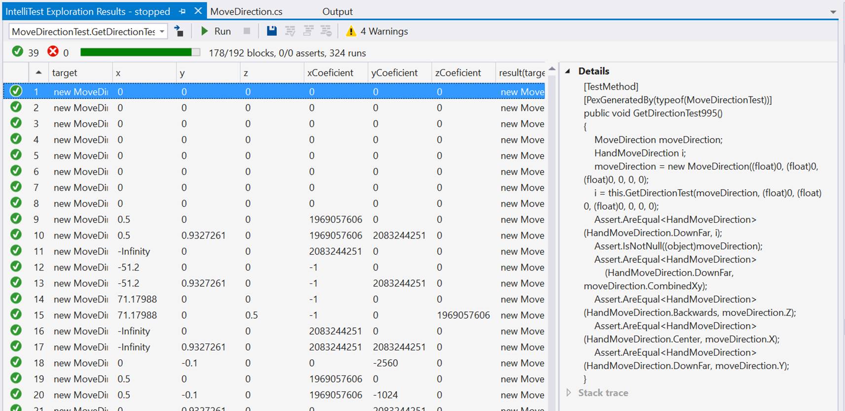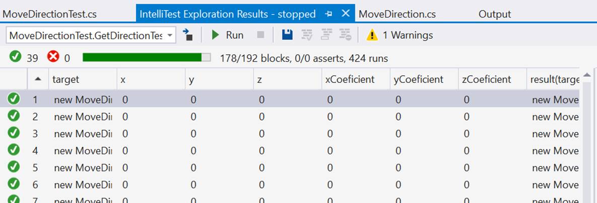 La generación automática ha generado 39 diferentes tests para probar las combinaciones de código que pueden afectar a la operación GetDirection(). Esta es la parte importante: