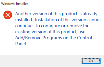 Another version of this product is already installed. Installation of this version cannot continue. To configure or remove the existing version of this product, use Add/Remove Programs on the Control Panel.