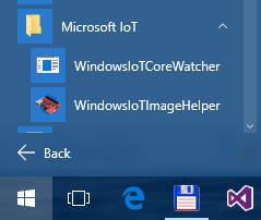 – Ahora ya podemos lanzar el asistente para grabar la tarjeta SD para utilizar en la Raspberry Pi 2. El mismo se llama WindowsIotImageHelper. Se puede acceder desde la lista de programas instalados