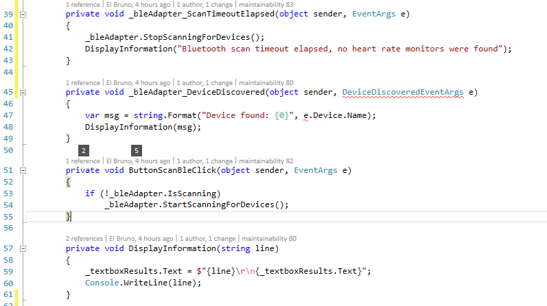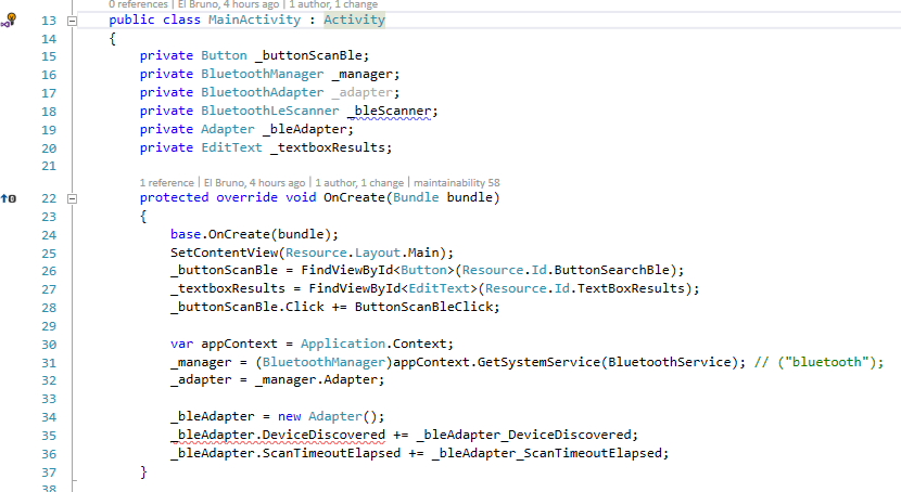 El siguiente paso es identificar el botón y la caja de texto. Además de crear una nueva instancia de BlueToothLeScanner para listar los dispositivos BlueTooth Low Energy y suscribirse a los eventos ScanTimeOutElapsed() y DeviceDiscovered().