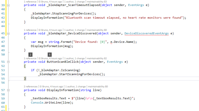 The next step is to identify the button and the text box. Also we need to creating a new instance of BlueToothLeScanner to list the BlueTooth Low Energy devices and subscribe to the ScanTimeOutElapsed() and DeviceDiscovered() events.