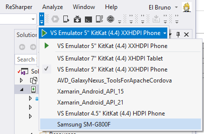 Now you can launch the emulator and have a fully working Android which supports Bluetooth and Bluetooth LE emulation. However, even if this works, the development experience is a bit poor. Personally I prefer to deploy the APK on my mobile and test the app in the phone. This also allows us to debug step by step and as a Developer in a very complete experience with Visual Studio 2015. For example, the following image shows the debugging options of Xamarin Android apps in Visual Studio. In addition to several VMs with Android, it is a plugged in Samsung device. This is so cool.