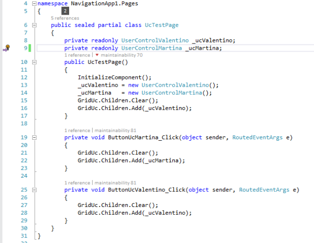 Como se puede ver en el video anterior, los 2 botones superiores cargan dinámicamente un User Control en una Grid. El código es bastante simple:
