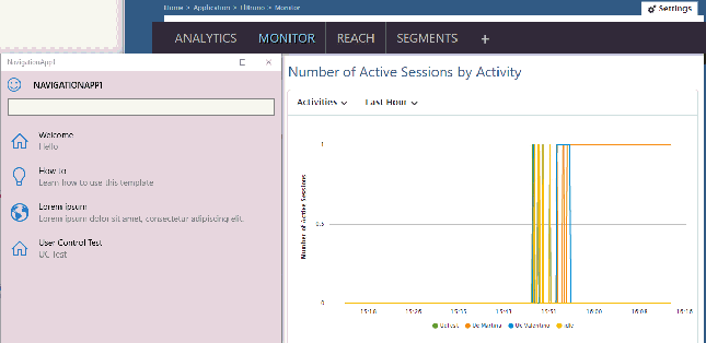 En mi caso, parte de una app se gestiona con User Controls que se cargan dinámicamente, y en la version actual del SDK, no tenemos un control del tipo Microsoft.Azure.Engagement.UserControl para cambiar el User Control. Eso no quita que después de aplicar unos cambios podamos tener una aplicación enviando información de actividades cada vez que se carga un user control. (El siguiente video tiene la velocidad del mismo acelerada para poder mostrar como la consola refleja los cambios cada vez que se carga dinámicamente un User Control en una Grid)