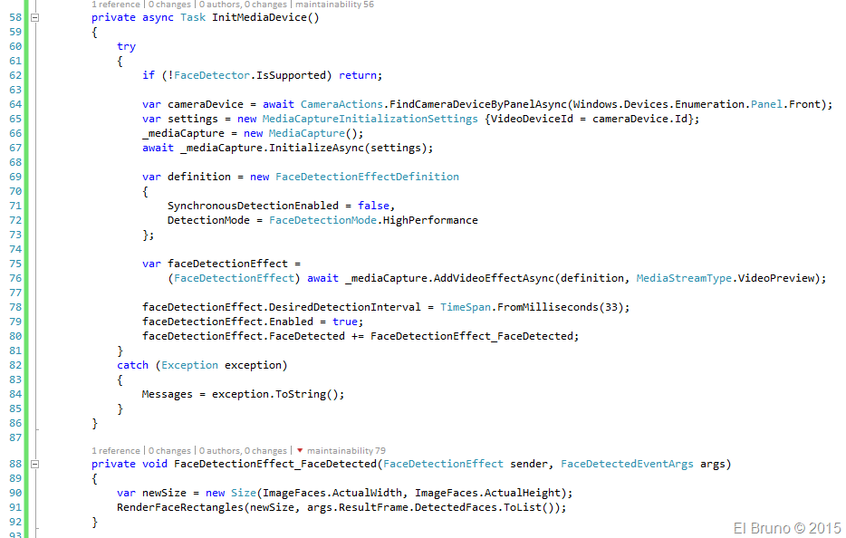 Otra forma de utilizarlo, es asociarlo a una instancia de MediaCapture(), que es la clase que utilizamos usualmente para acceder a la cámara en Windows 8 / 8.1 / 10. El siguiente ejemplo, nos muestra como al momento de inicializar el MediaCapture, podemos agregar un nuevo “efecto” (línea 75) con un FaceDetectionEffectDefinition, para la detección de rostros.
