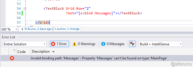 Esto significa que, si por ejemplo, estamos asociando el texto de un TextBlock a una propiedad “Messages”, si la misma no existe en la clase definida en el namespace “x:”, pues tendremos un error de compilación.