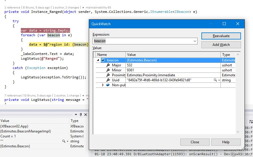 Cuando la app detecta uno o más beacons, el evento Ranged() retorna una colección de los mismos. Como comentaba en el punto anterior, los valores de UUID, Major y Minor se incluyen para cada beacon, además de una propiedad para definir la cercania del beacon.
