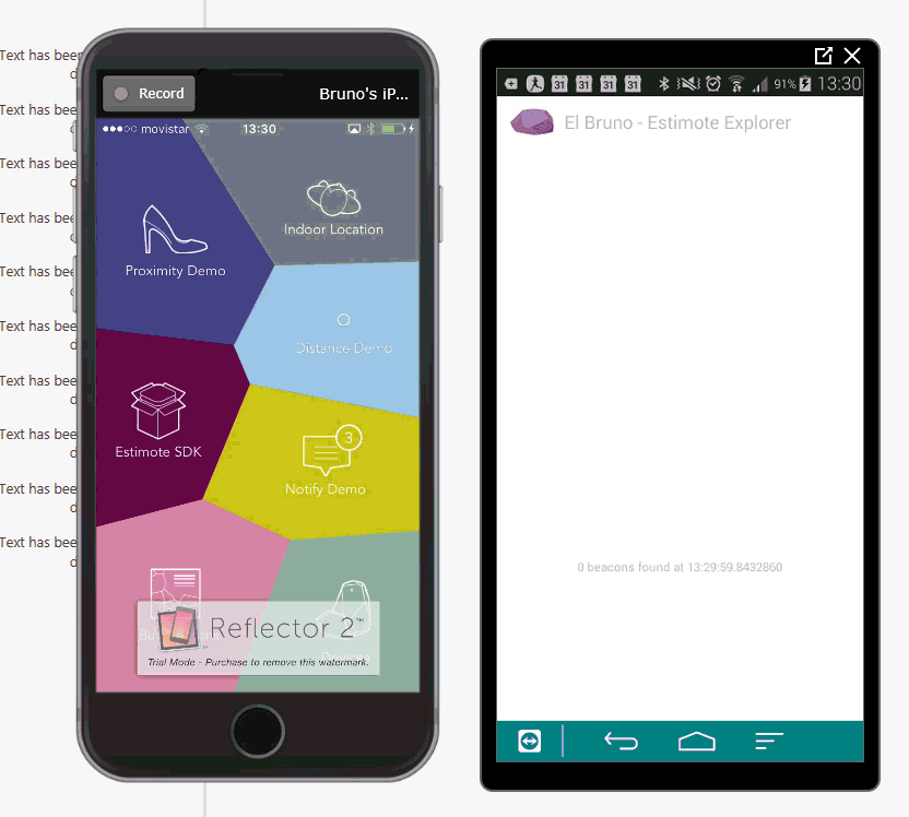 En el video anterior es posible ver como en el iPhone (izquierda) la app detecta beacons y al mismo tiempo en la app creada con Xamarin (derecha) muestra los beacons. De la misma forma, cuando en la app de Estimote en el iPhone se activa el virtual beacon, en el Estimote Explorer aparecen 2 beacons.
