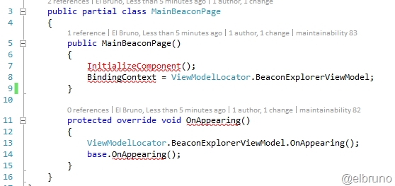 - La app tiene un implementación de 5 min de un modelo MVVM para poder refrescar la lista de Beacons en tiempo real. No tengo claro el porqué, pero al momento de separar View y ViewModel, el intellisense de Visual Studio ha perdido el norte.