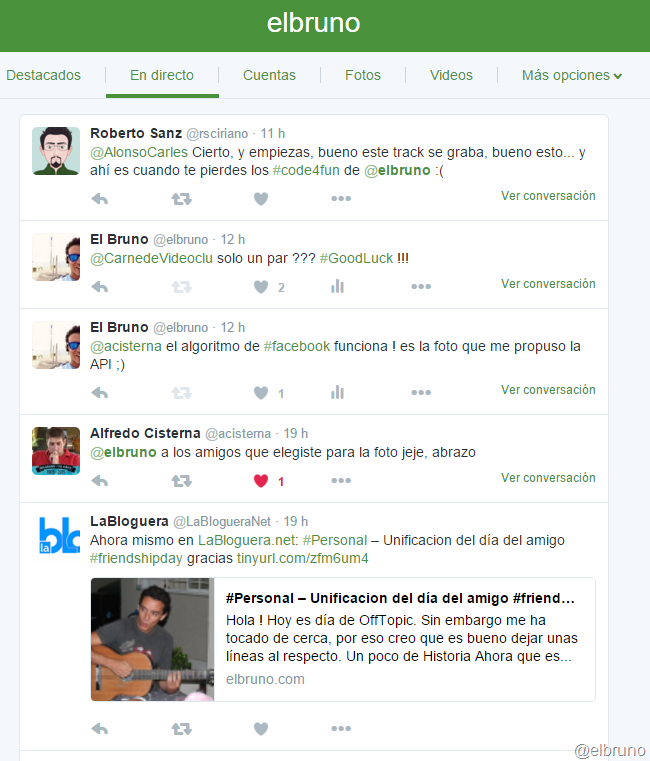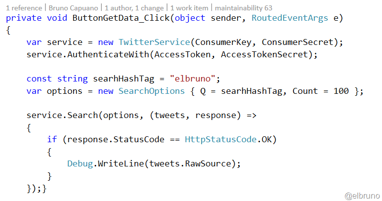 El siguiente código muestra un ejemplo simple sobre una búsqueda con el criterio “elbruno”