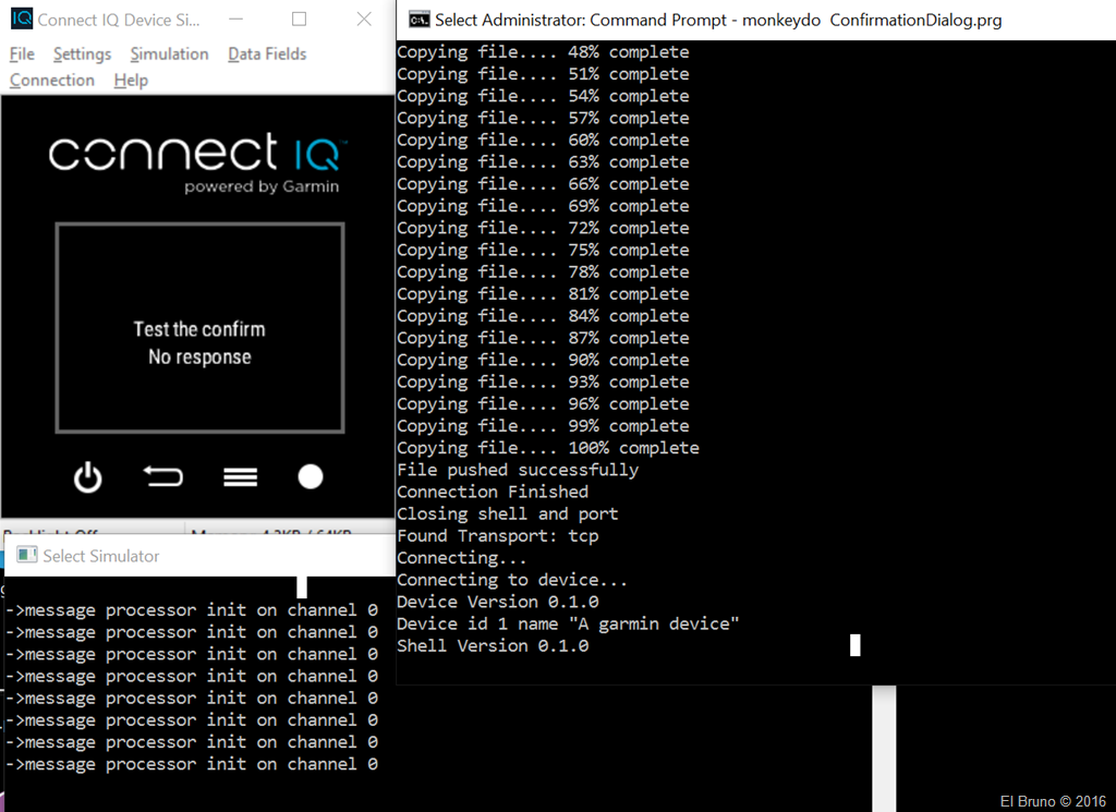 El output del proceso de compilación generará una app en un archivo llamado “ConfirmationDialog.prg”. El siguiente paso es lanzar el emulador y ejecutar la app compilada en el mismo.