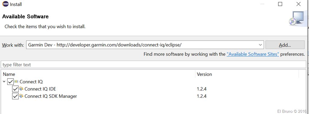 Once we have installed Eclipse, we must add the extension to work with Garmin Apps projects. So we access to the menu “Help / / Install new Software”
