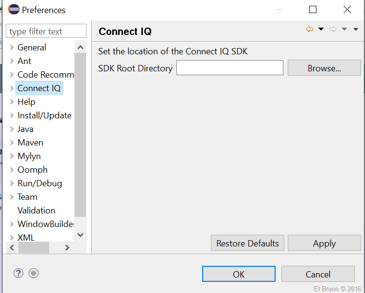 We accept the EULA, restart Eclipse and now is time to configure the location of the Connect IQ SDKÂ in Eclipse. In the “Windows / / Preferences” menu select the option Connect IQ and the same configure the location of the SDK,